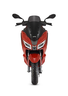 Das Design der Aprilia SXR 50 ist modern und unverkennbar: Die Frontpartie mit dem grossen Beinschild wird von einem mittig platzierten LED-Scheinwerfer dominiert. Der Doppelscheinwerfer wird in der Mitte durch ein drittes Element ergänzt und betont so die Verwandtschaft mit den Dreifachscheinwerfern der grossen Sportmotorräder von Aprilia. Die vordere Lichteinheit umfasst zudem ein integriertes Tagfahrlicht, ebenfalls in LED-Technik, sowie die beiden Blinker. Der hochgezogene Lenker und die mit dem Beinschild verbundene Windschutzscheibe verleihen dem Fahrzeug die Optik eines grossen Tourenrollers.