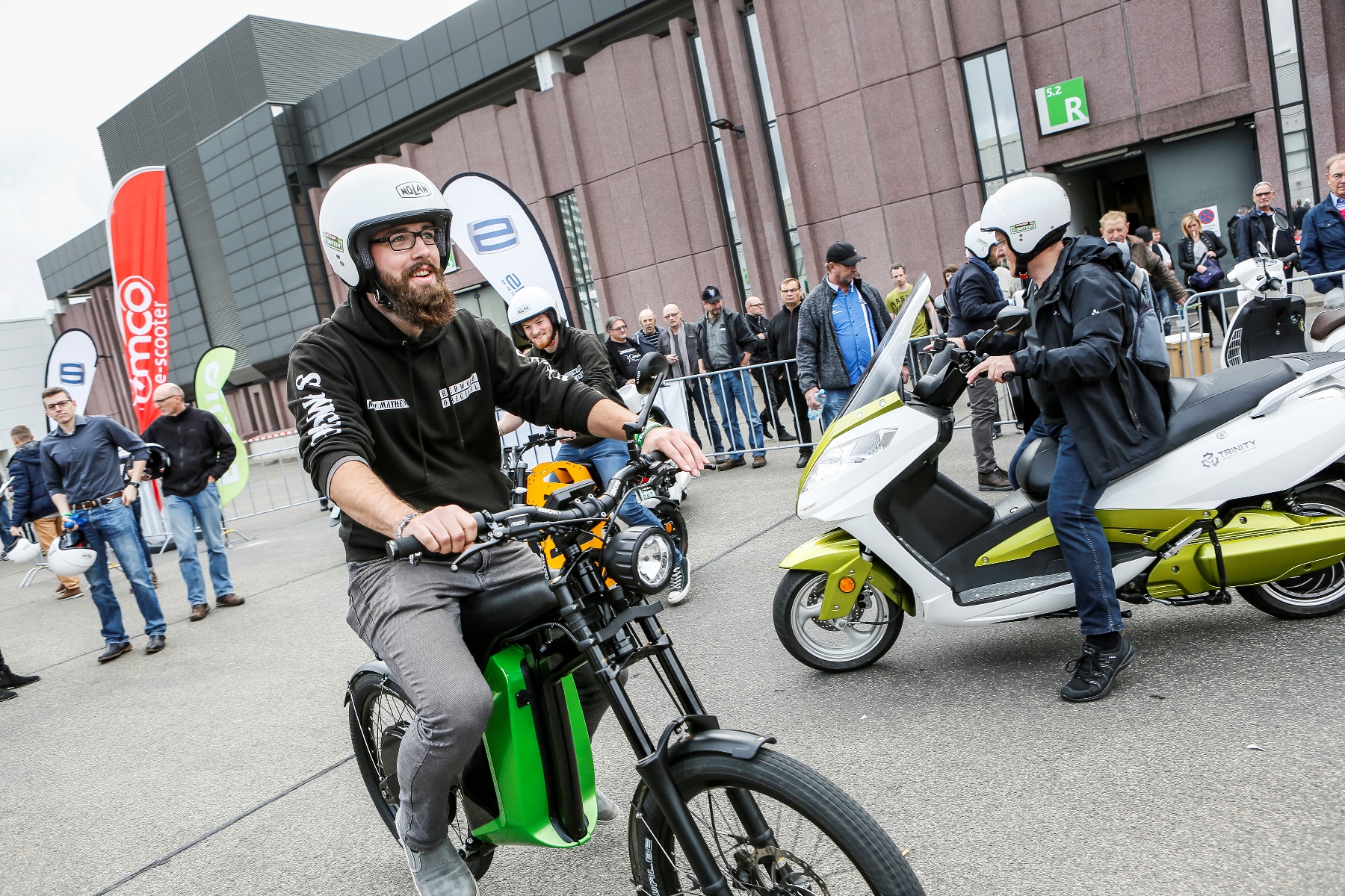 Hier stehen beispielsweise Energica, Kumpan electrics, emco electroroller, NITO, NIU, Vmoto, Citycoco oder Walberg. Der E-Scooter-Parcours startet nun auf der großen Eventfläche hinter der Halle 8, wo sich außerdem die Stunt- und Freestyle-Show-Area und der Parcours „Fahren ohne Führerschein“ befindet. Hier kann man Roller und 125ccm-Bikes testen und so erste Erfahrungen auf einem motorisierten Zweirad sammeln. Die E-Bikes finden sich ab sofort in Halle 8 wieder – hier kann ebenfalls getestet werden. Der große und bekannte E-Bike Parcours bleibt dabei selbstverständlich erhalten. Als „E-Bike City“ bietet er den Besuchern die Möglichkeit, im nachgestellten Straßenverkehr die Räder im Alltag zu testen.