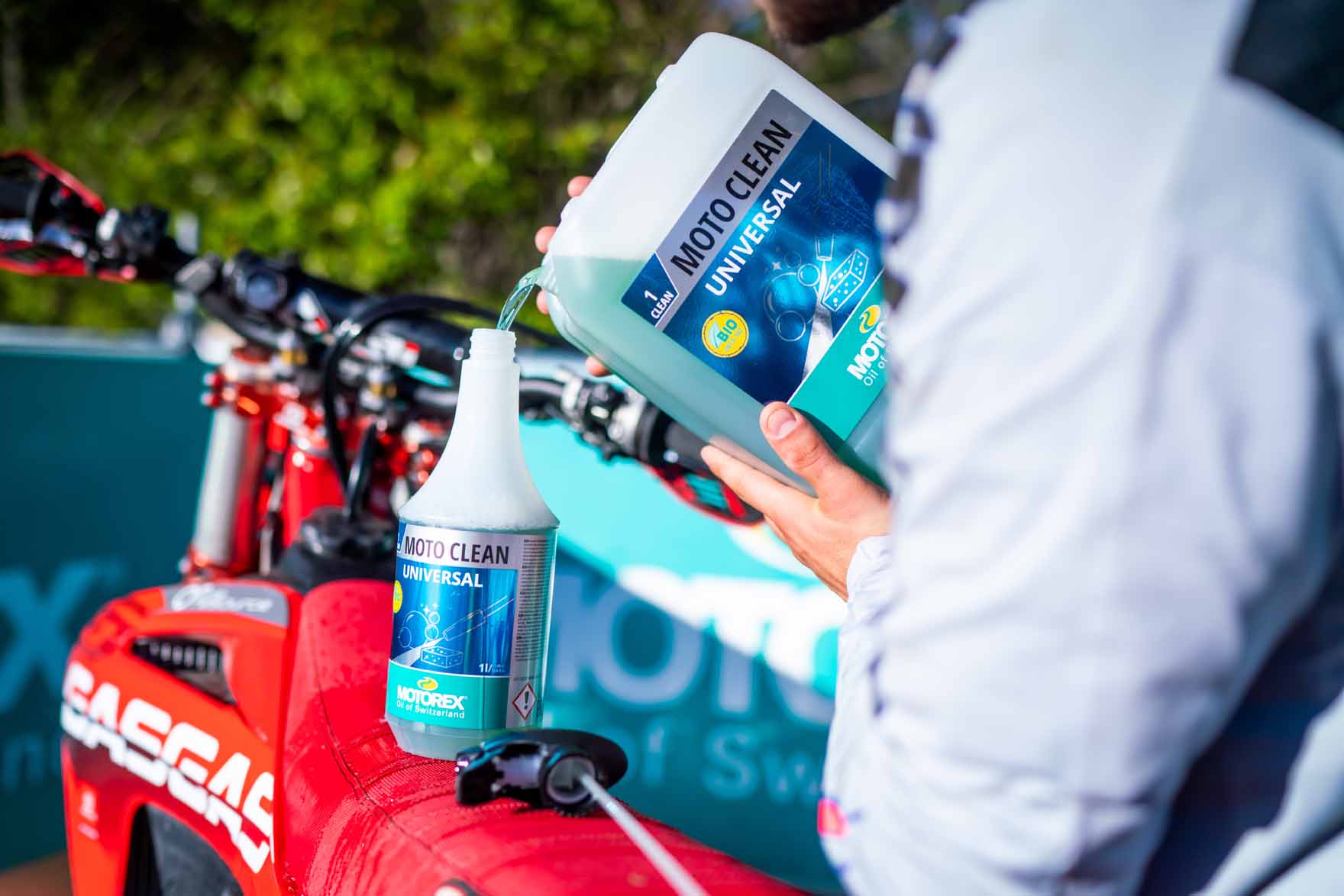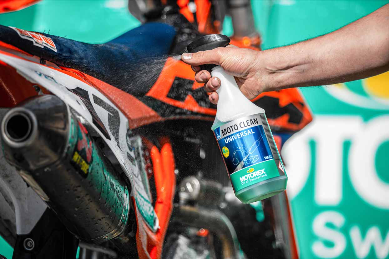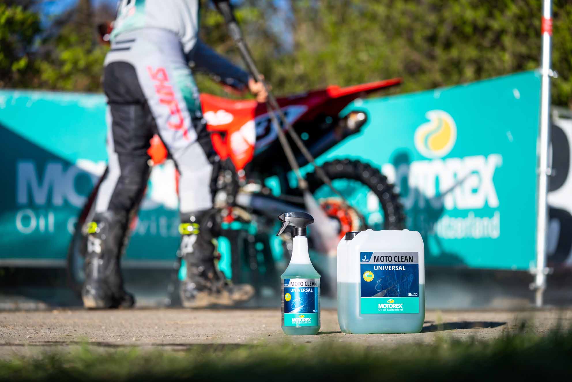 Neu im Team ist MOTO CLEAN UNIVERSAL. Die neue Rezeptur als Light-Variante mit nicht ganz so extremer Reinigungskraft hat MOTOREX speziell für die Bedürfnisse der Offroad-Fraktion entwickelt. Die Flaschenform unterscheidet sich ebenso von der stärkeren Version wie der Sprühkopf ohne 360-Grad-Funktion. Auch MOTO CLEAN UNIVERSAL kommt in einer stabilen, transparenten 1-Liter-Flasche mit Handzerstäuber, die praktisch ein ganzes Motorradleben lang hält und sich aus dem 5-Liter-Kanister nachfüllen lässt.