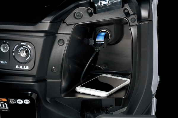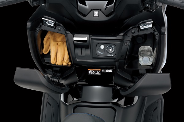 Trotz des schlanken, kompakten Heckdesigns gibt es immer noch reichlich Stauraum unter der Sitzbank. 42 Liter Stauraum ermöglichen die Unterbringung von zwei Helmen (ein Integral- und ein Halb-Jet-Helm). Zwei Frontfächer bieten 2,8 Liter *1 Stauraum auf der linken Seite und 3,5 Liter *2 auf der rechten Seite. Ein Fach beherbergt eine 12-V-Steckdose *3 zum Aufladen eines Mobiltelefons oder anderer elektronischer Geräte.