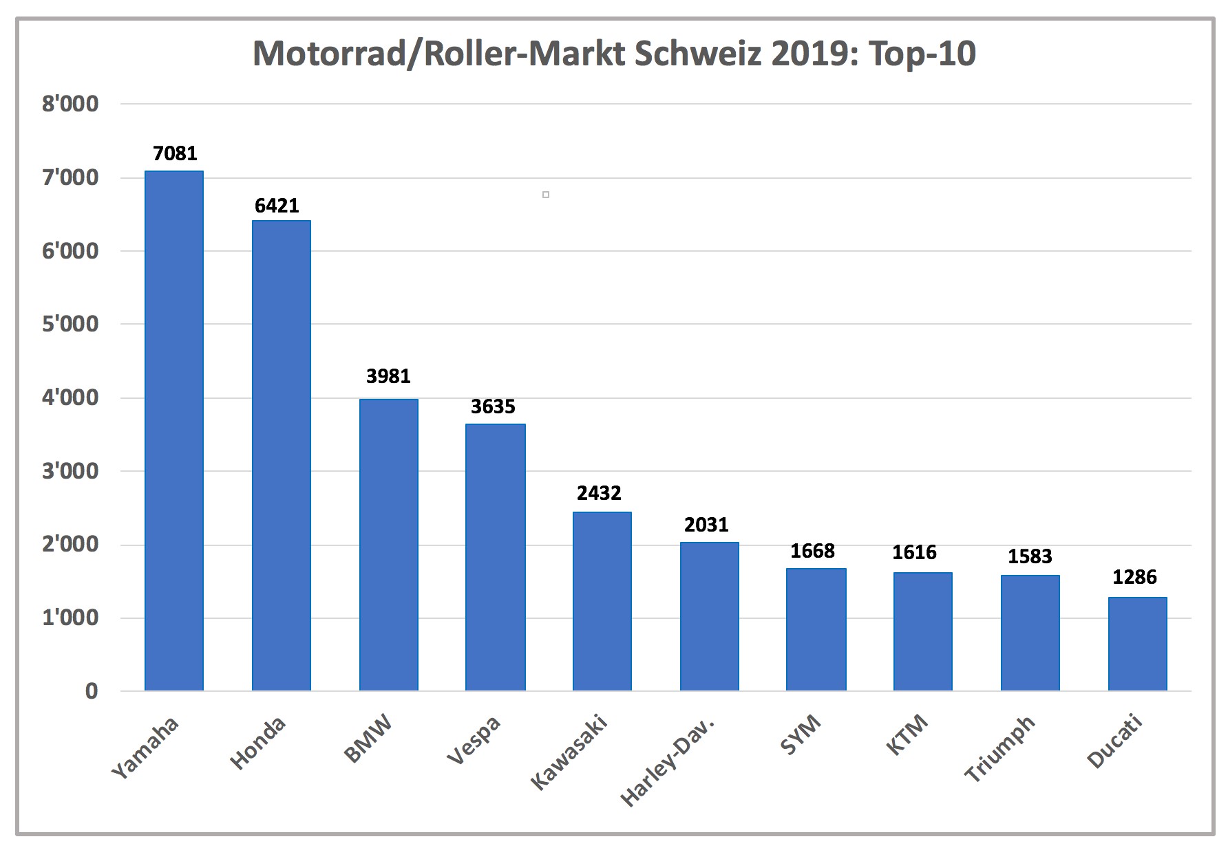 (SFMR) Mit 24’254 Neuzulassungen schloss der Schweizer Motorradmarkt 2019 auf fast identischem Niveau wie im Vorjahr (24‘541 Einheiten) ab und verharrt auf hohem Niveau. Der Rollermarkt ging aufgrund der verkehrspolitischen Veränderungen im urbanen Bereich um 7 % zurück. Der Gesamtmarkt sank um 3,9 % von 43‘166 (2018) auf 41‘464 Stück.