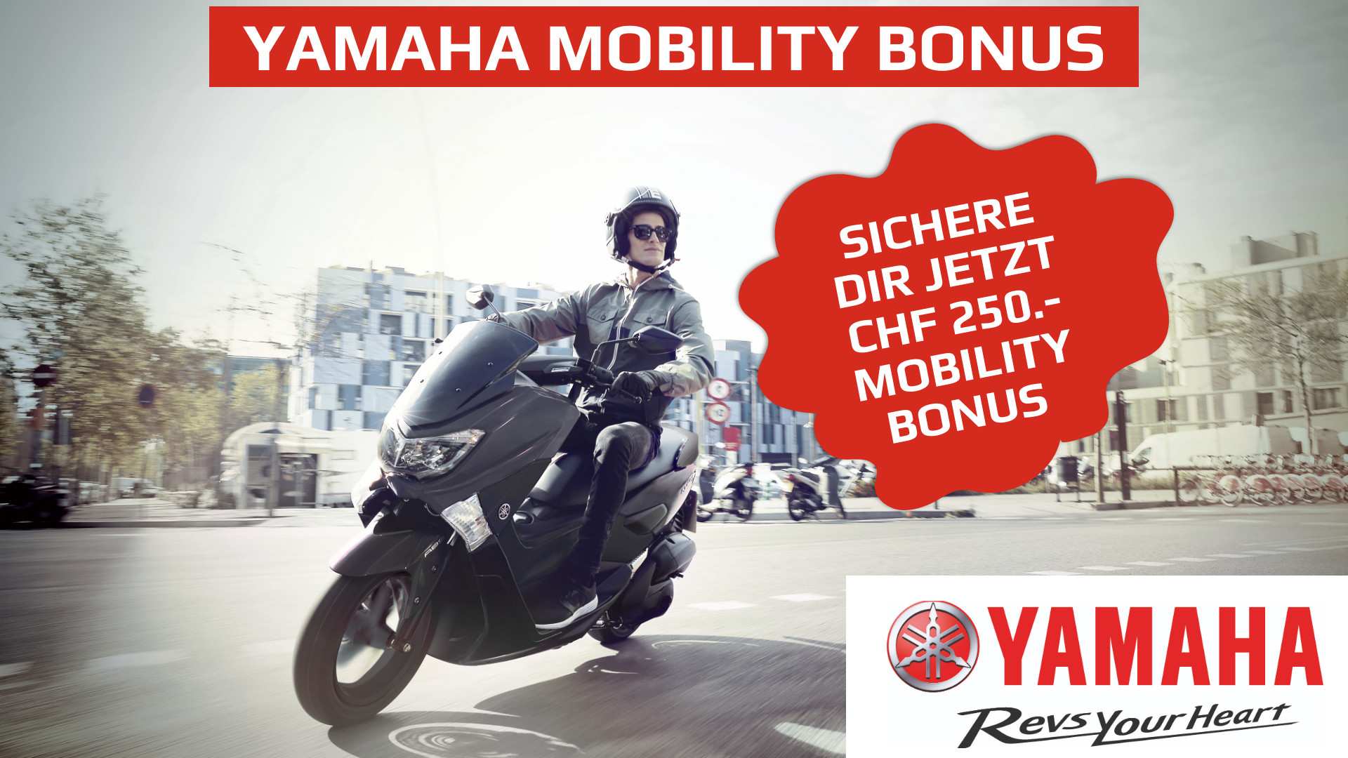 In der aktuell vom Corona Lockdown geprägten Zeit gewinnt individuelle Mobilität weiter an Bedeutung. Roller von Yamaha sind hochwertig, zuverlässig und sicher. Sie benötigen wenig Platz im Verkehr und beim Parkieren, sie sind einfach zu fahren, sparsam und flexibel. Wer sich jetzt für den Kauf eines Yamaha NMAX 125 oder D‘elight 125entscheidet, profitiert vom Mobility Bonus im Wert von 250 Franken. Doch aufgepasst, diese einmalige Promotion ist auf 300 Stück begrenzt. Gut zu wissen: Automobilisten dürfen 125er Roller nach 8 Std. Grundkurs prüfungsfrei fahren. Ab 2021 sind 12 Std. Grundkurs vorgeschrieben.