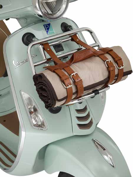 Sia il cestino sia il telo, impreziositi dal logo Vespa Pic Nic, possono essere trasportati comodamente sui portapacchi posteriore e anteriore cromati, di serie su questa speciale versione, arricchiti da una cinghia in cuoio marrone che funge anche da manico per trasportare agevolmente a mano il telo ripiegato.Vespa Pic Nic