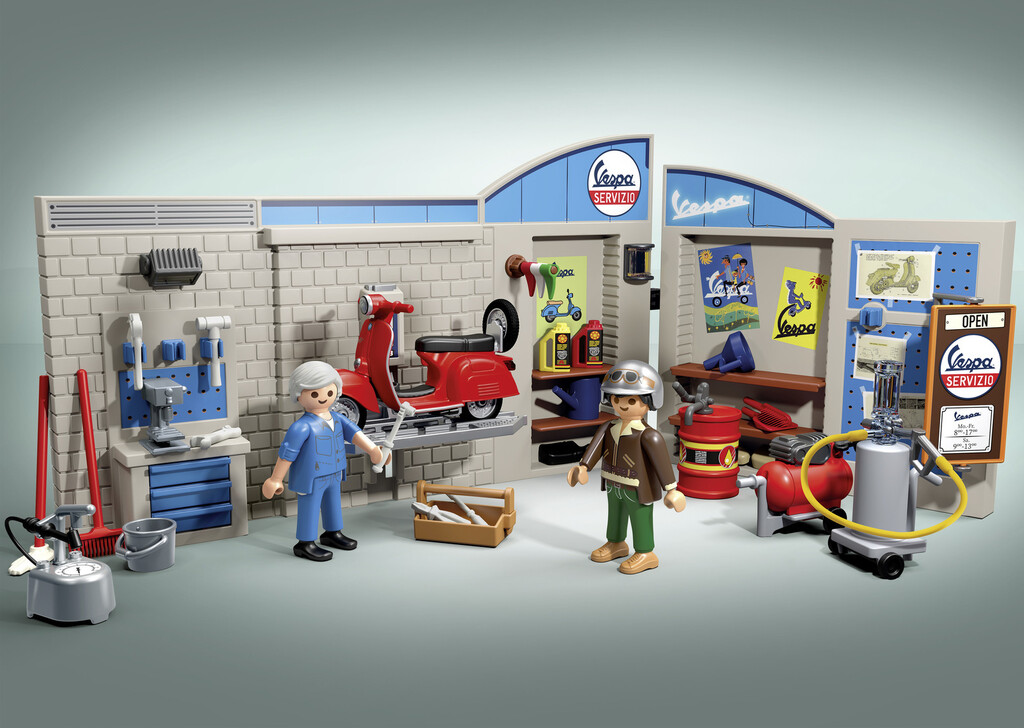 Mais ce n’est pas tout : Playmobil propose également un atelier de réparation de scooters en tant que set supplémentaire. Outre une Vespa rouge et deux figurines, le paquet contient entre autres un pont élévateur, un établi et une pompe à essence.