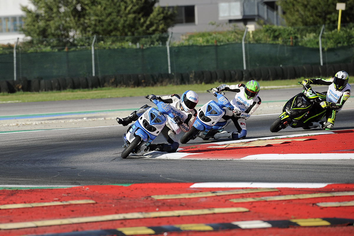Le prime fasi di gara della Scooter 70 Evolution SuperSport con lo sloveno Luka Koren (74), grande protagonista del round di Adria, qui inseguito da Luca Zani (24), Davide Marola (56) e Martin Mihael (75).